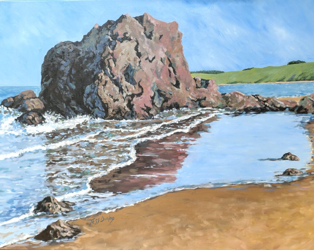 East Bay, North Berwick – a large canvas capturing the sunlight on the rock formations and shoreline.