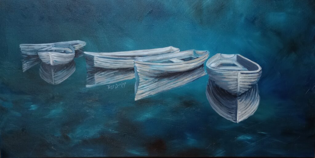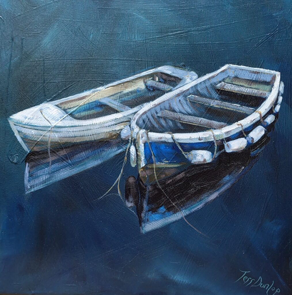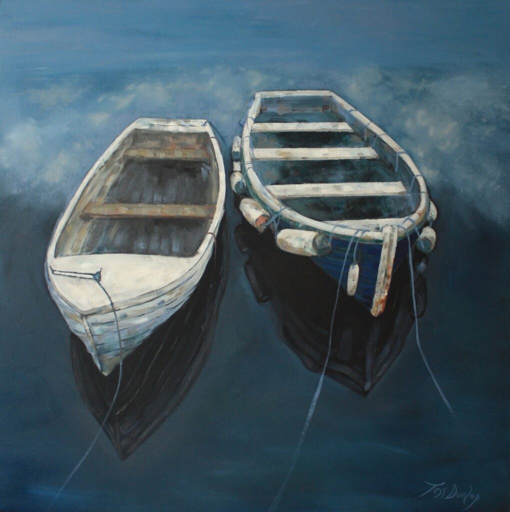 Into the Blue – a reflective study of two moored boats against deep water tones — now sold.