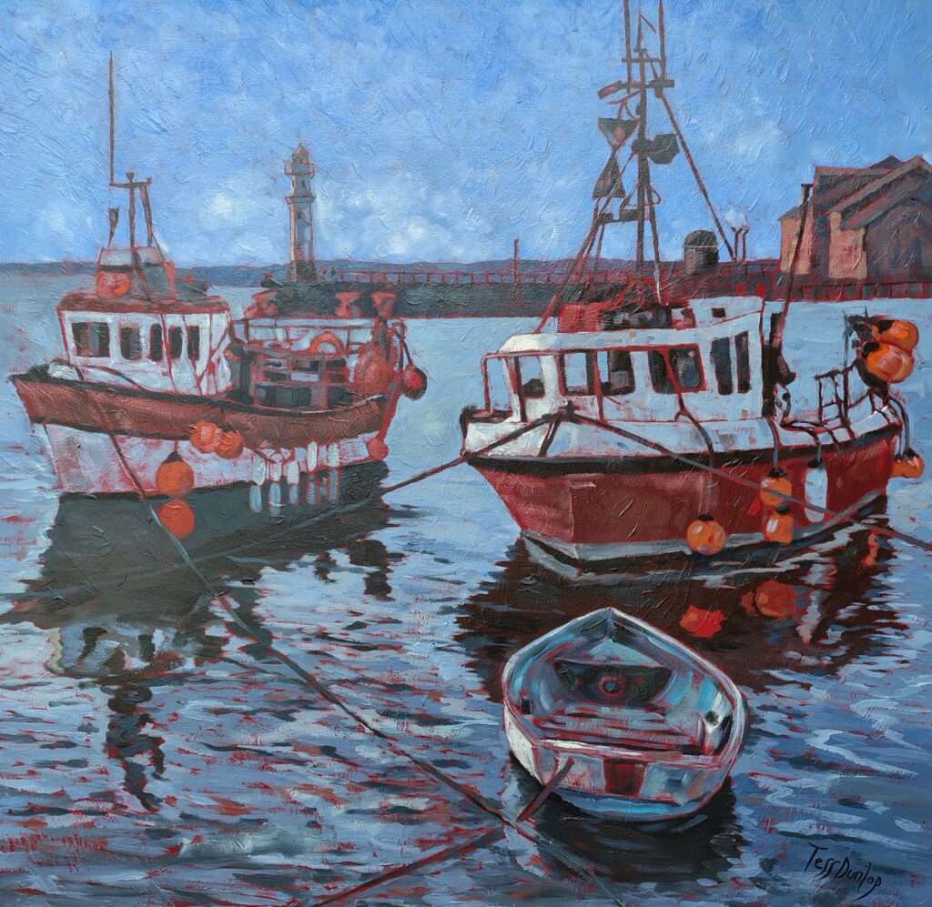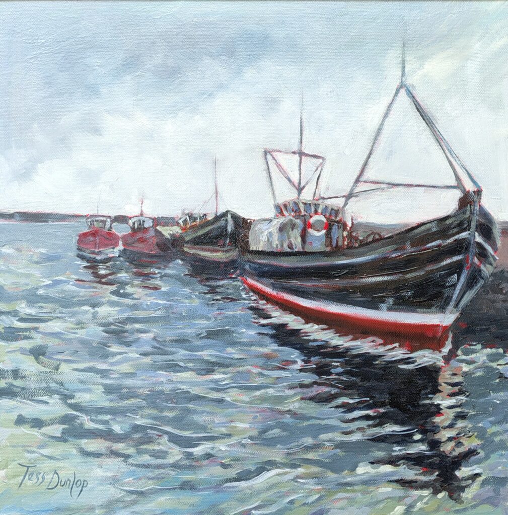 Mothership – a striking coastal painting with moored fishing boats, balancing movement and stillness.