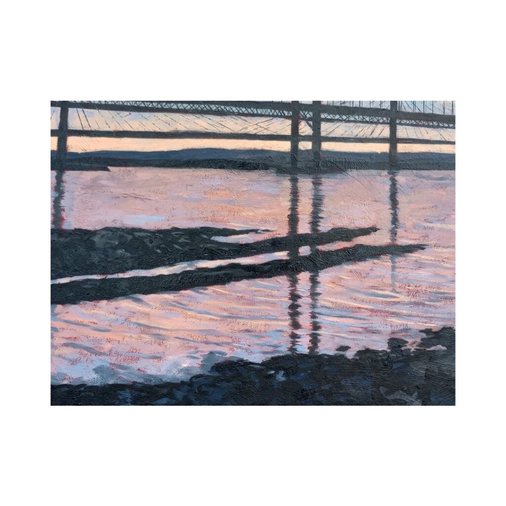 Painted over a red underpainting with selected areas showing through in a broken colour technique. and featuring the old and new road bridges across the Forth, Scotland